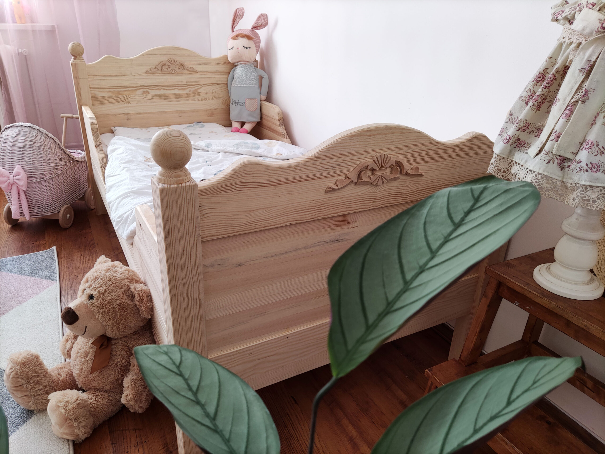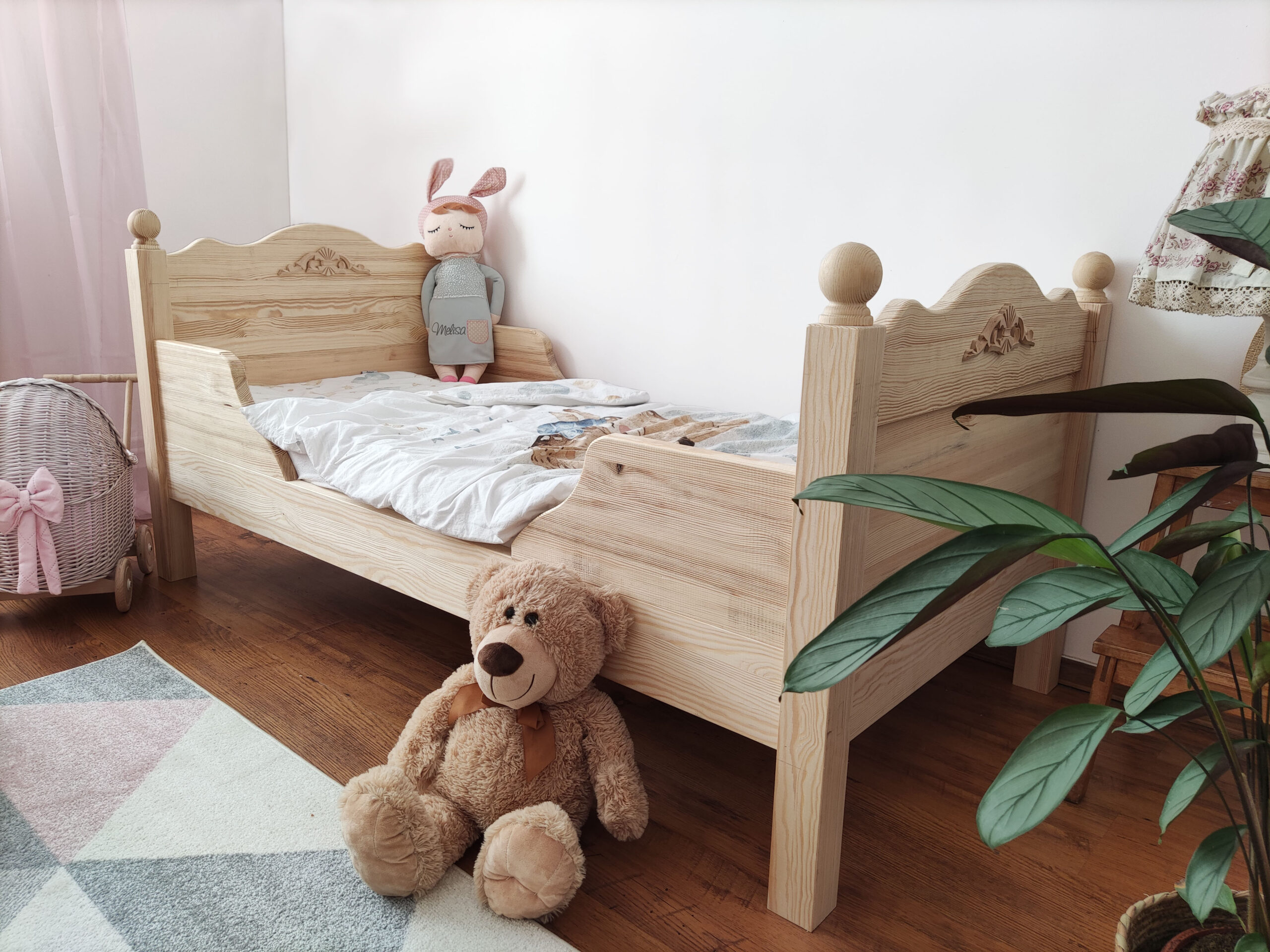 W zestawie rama łóżka, barierki, wezgłowie, zanóżek, stelaż pod materac.
