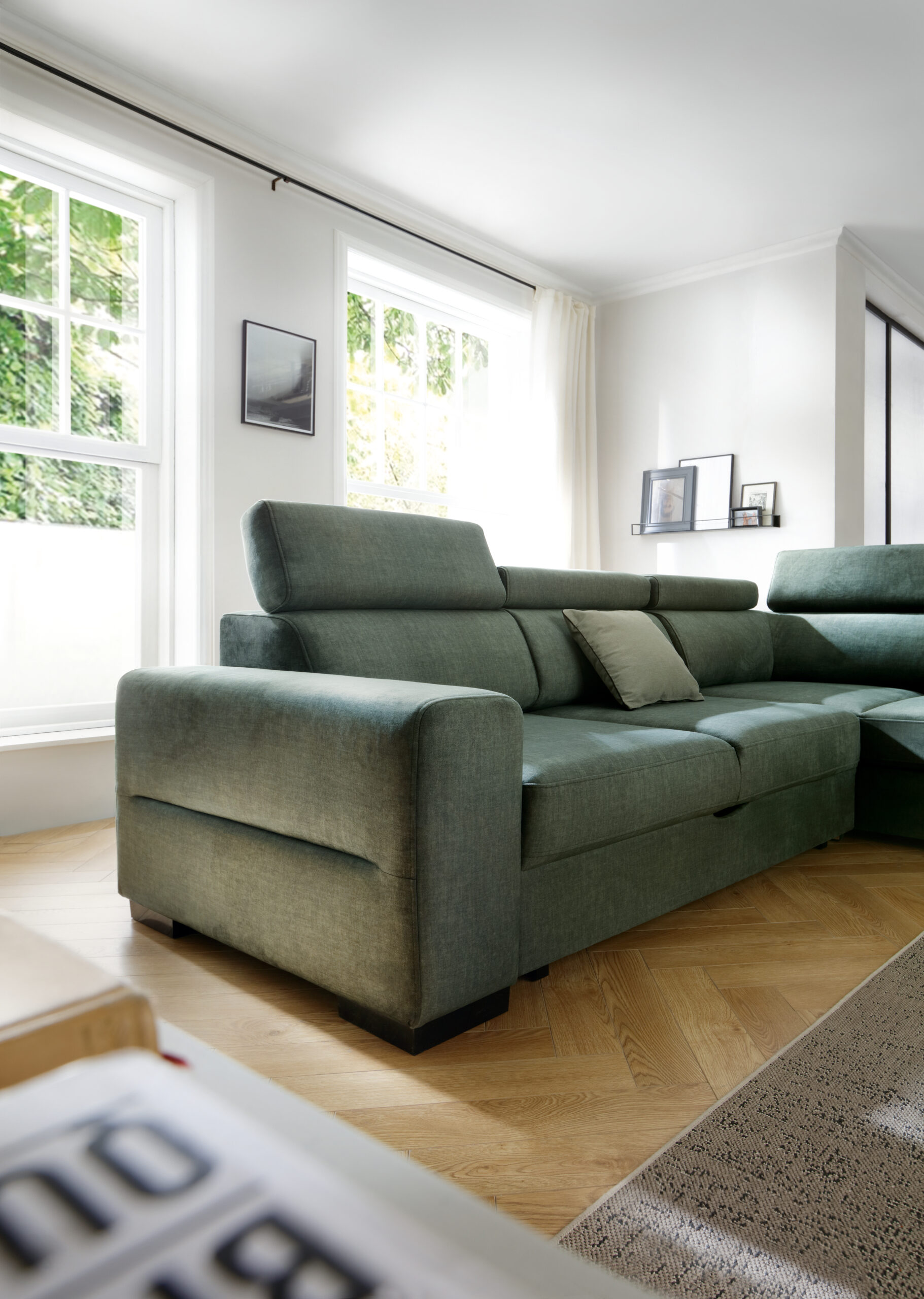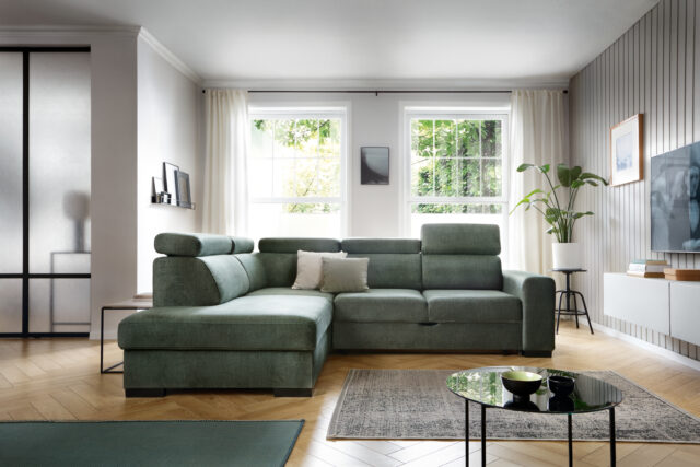Pojemnik na pościel, w który wyposażony jest ten narożnik, ułatwi nam przechowywanie pościeli, koców itp.