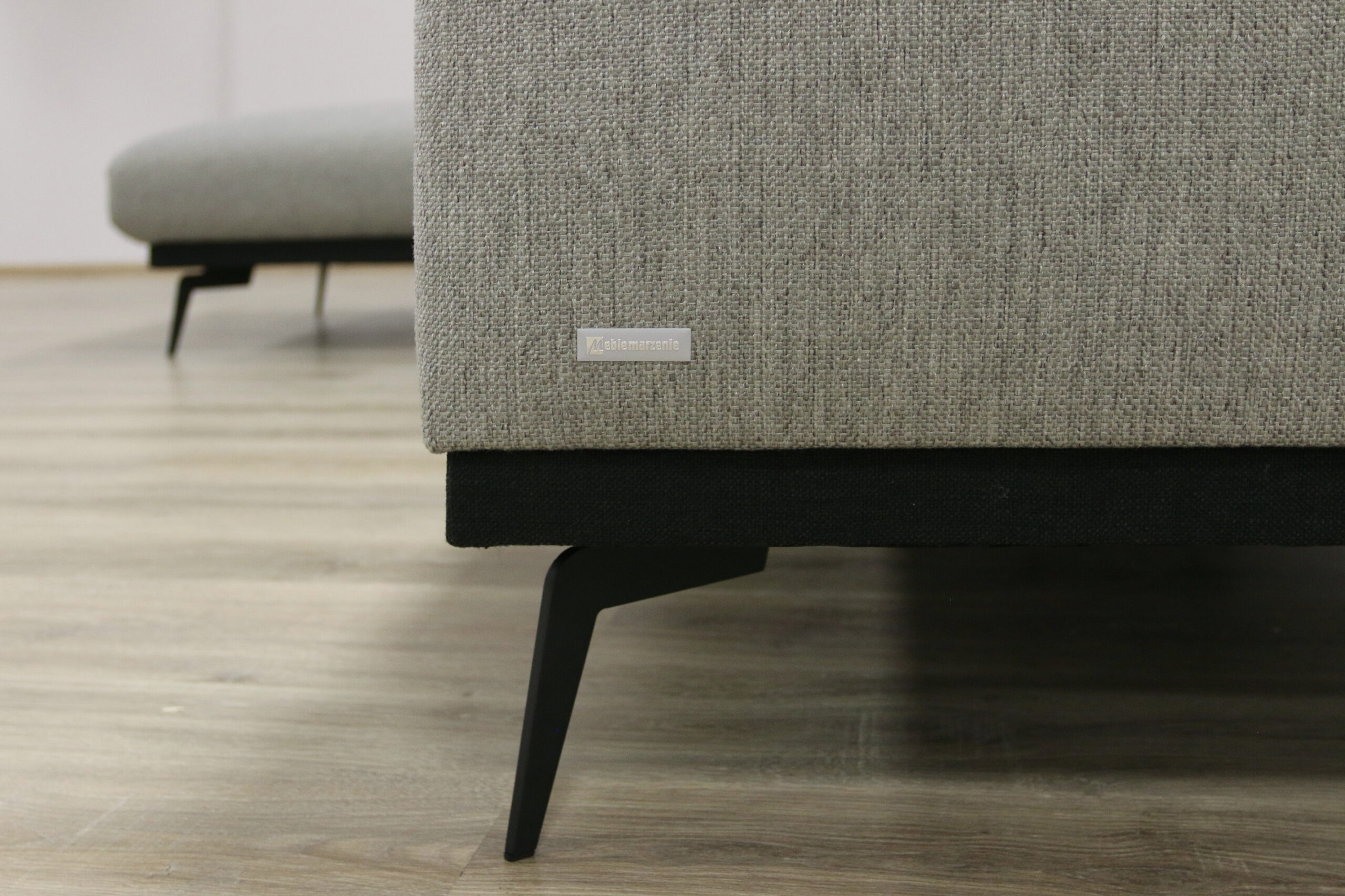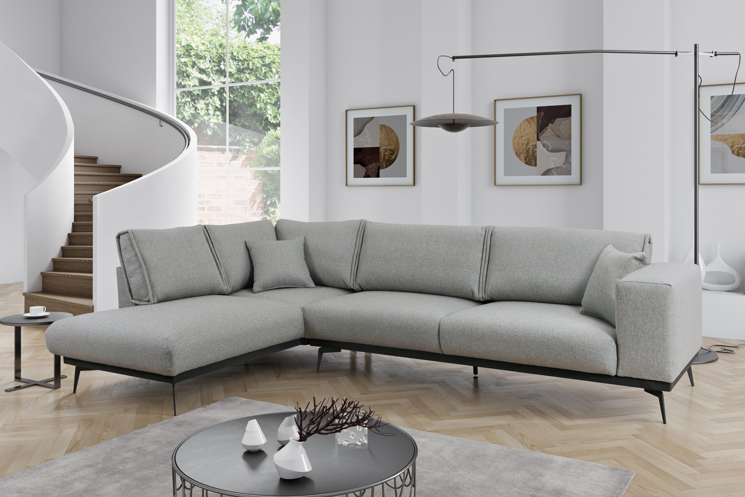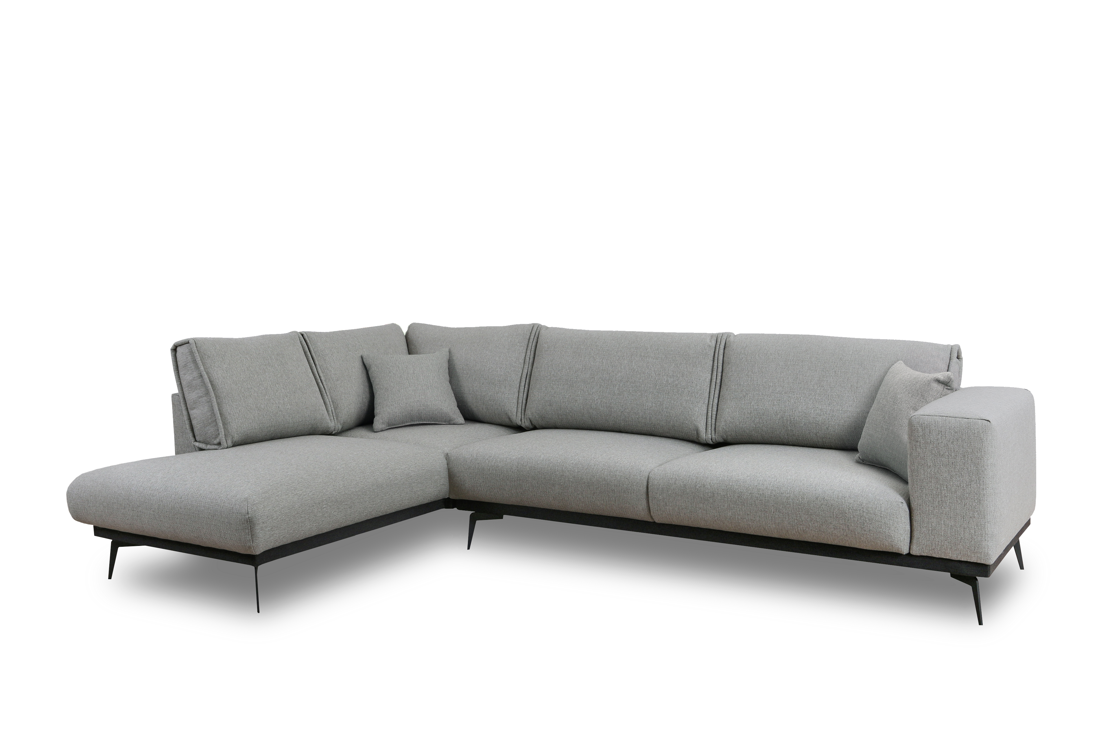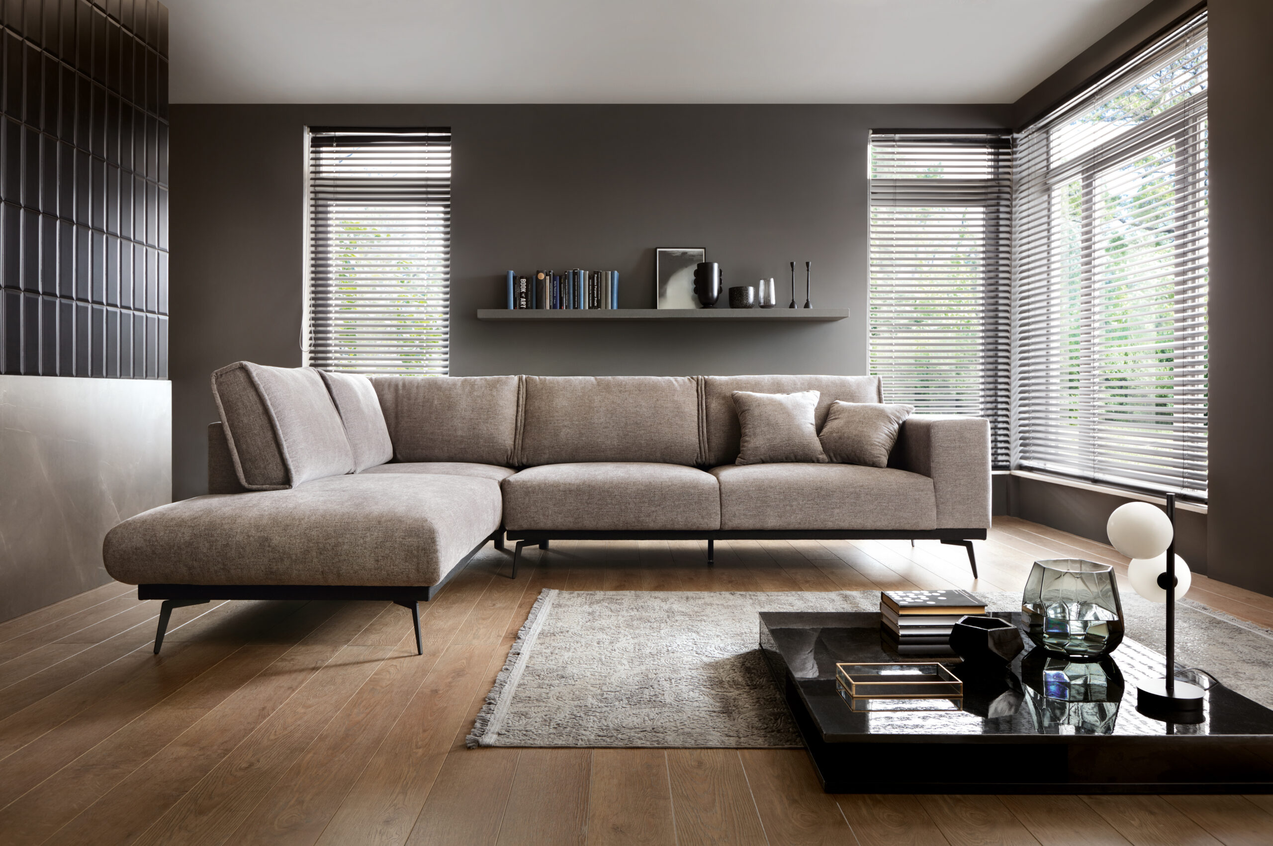 Narożnik Tristan to nie tylko najwyższy komfort, ale również nowoczesny design. Segmenty na siedzisku współgrają z poduchami oparciowymi, które dodatkowo zostały obszyte lamówką. Interesującym detalem w tym narożniku jest podstawa, pokreślona czarną tkaniną. Nawiązuje ona do modernistycznych, metalowych nóżek w kolorze czarnym. Dzięki temu, że są one wysokie i dość smukłe, całość prezentuje się lekko. Co też ważne w codziennym użytkowaniu, wysokie nóżki umożliwiają nam odkurzenie podłogi pod meblem.