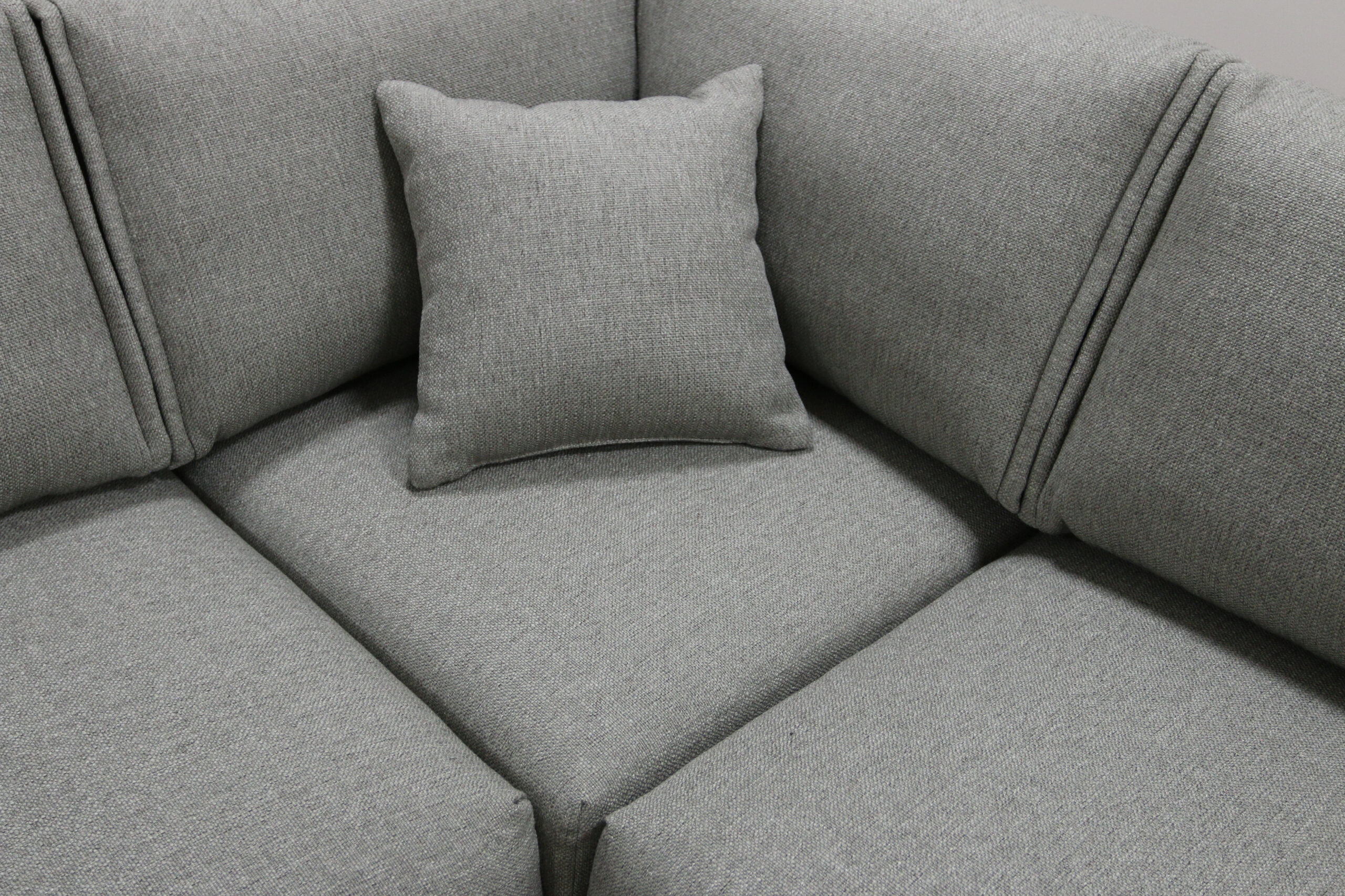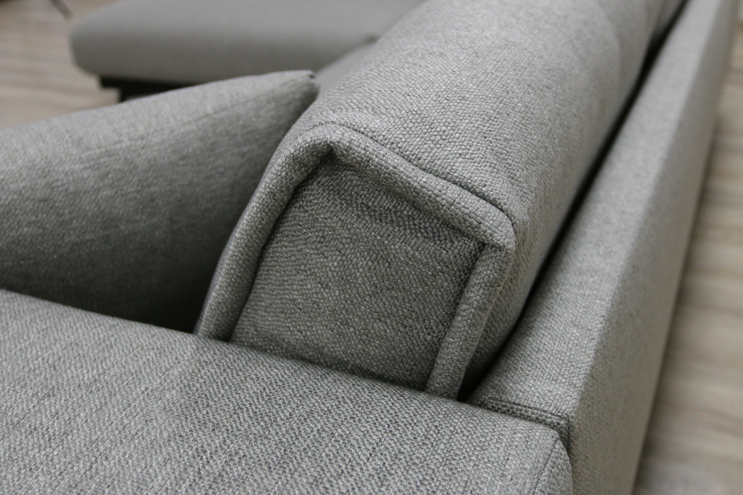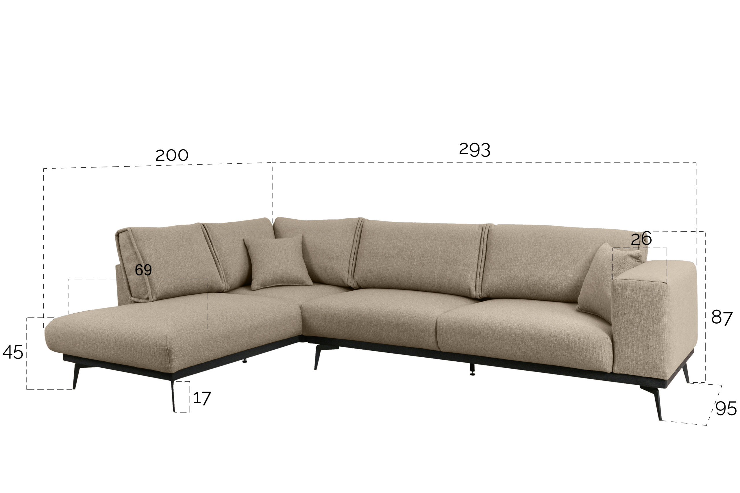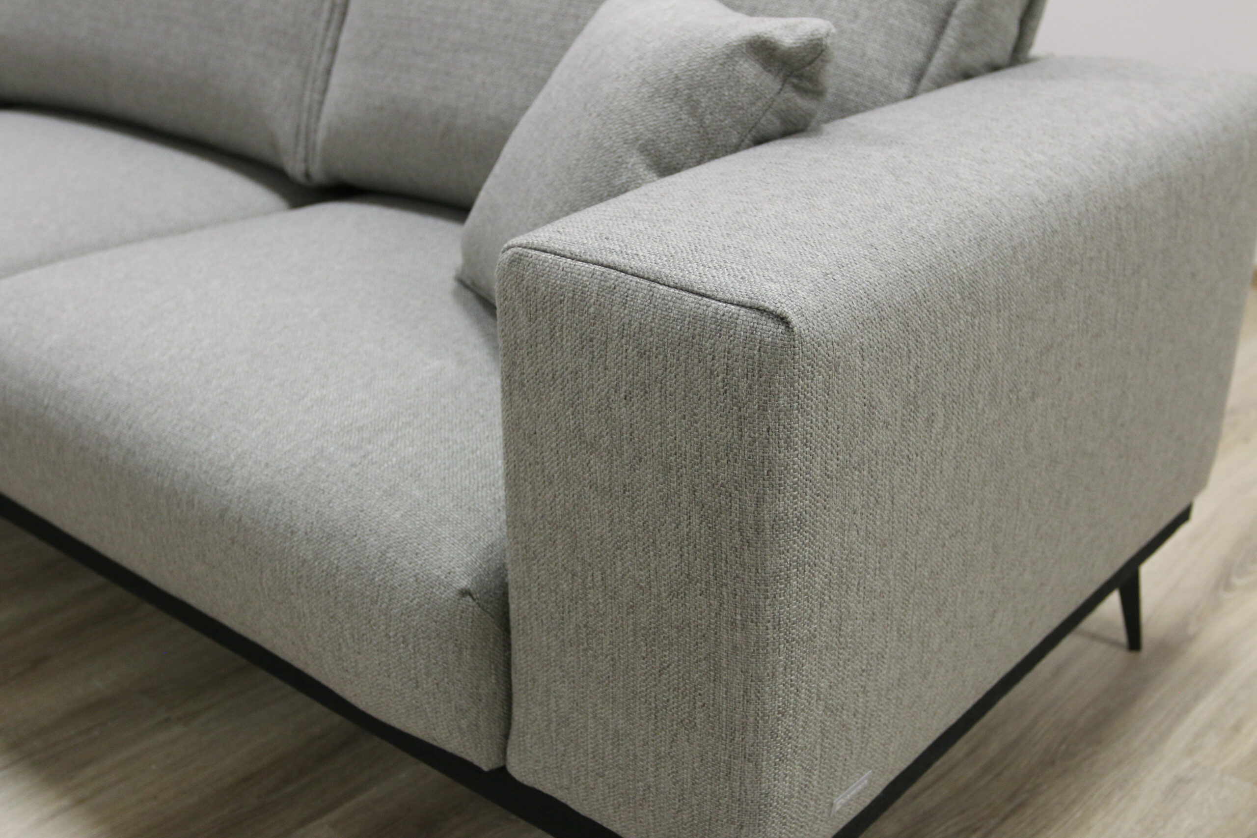 Narożnik Tristan to nie tylko najwyższy komfort, ale również nowoczesny design. Segmenty na siedzisku współgrają z poduchami oparciowymi, które dodatkowo zostały obszyte lamówką. Interesującym detalem w tym narożniku jest podstawa, pokreślona czarną tkaniną. Nawiązuje ona do modernistycznych, metalowych nóżek w kolorze czarnym. Dzięki temu, że są one wysokie i dość smukłe, całość prezentuje się lekko. Co też ważne w codziennym użytkowaniu, wysokie nóżki umożliwiają nam odkurzenie podłogi pod meblem.